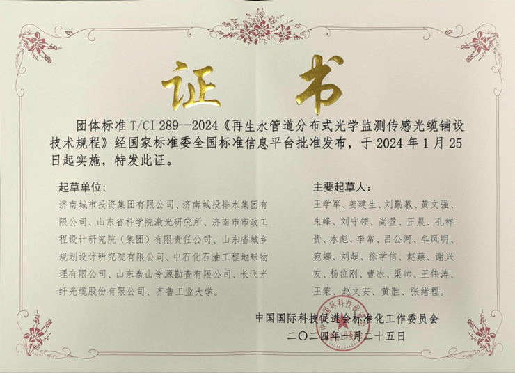 2024年1月25日,济南城投排水集团起草编制的《再生水分布式光学监测传感光缆铺设技术规程》团体标准正式发布。